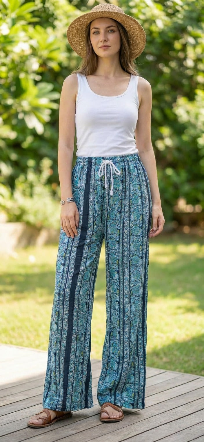 Crop Top | Boho Printed Drawstring Wide-Leg Trousers