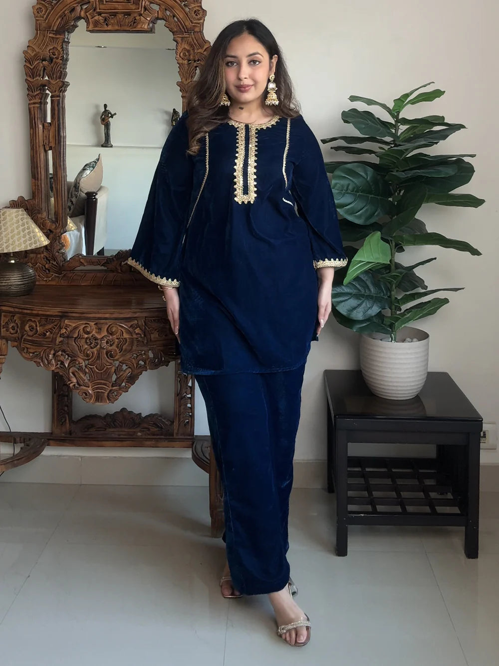 • Step into effortless elegance with this teal blue velvet co-ord set from cyenora. The kurta features a classic round neckline adorned with intricate gold lace detailing on the yoke, creating a rich linear pattern that beautifully elevates the plush velvet fabric. The lace extends gracefully along the neckline and front panel, adding depth and a touch of festive charm. Flared sleeves finished with matching lace enhance the silhouette with subtle movement. Paired with straight velvet pants featuring a fully elasticated waistband, inner drawstring, and side pocket, this set ensures comfort and style. Complete the look with gold statement studs or a delicate kundan bracelet for a polished ensemble.